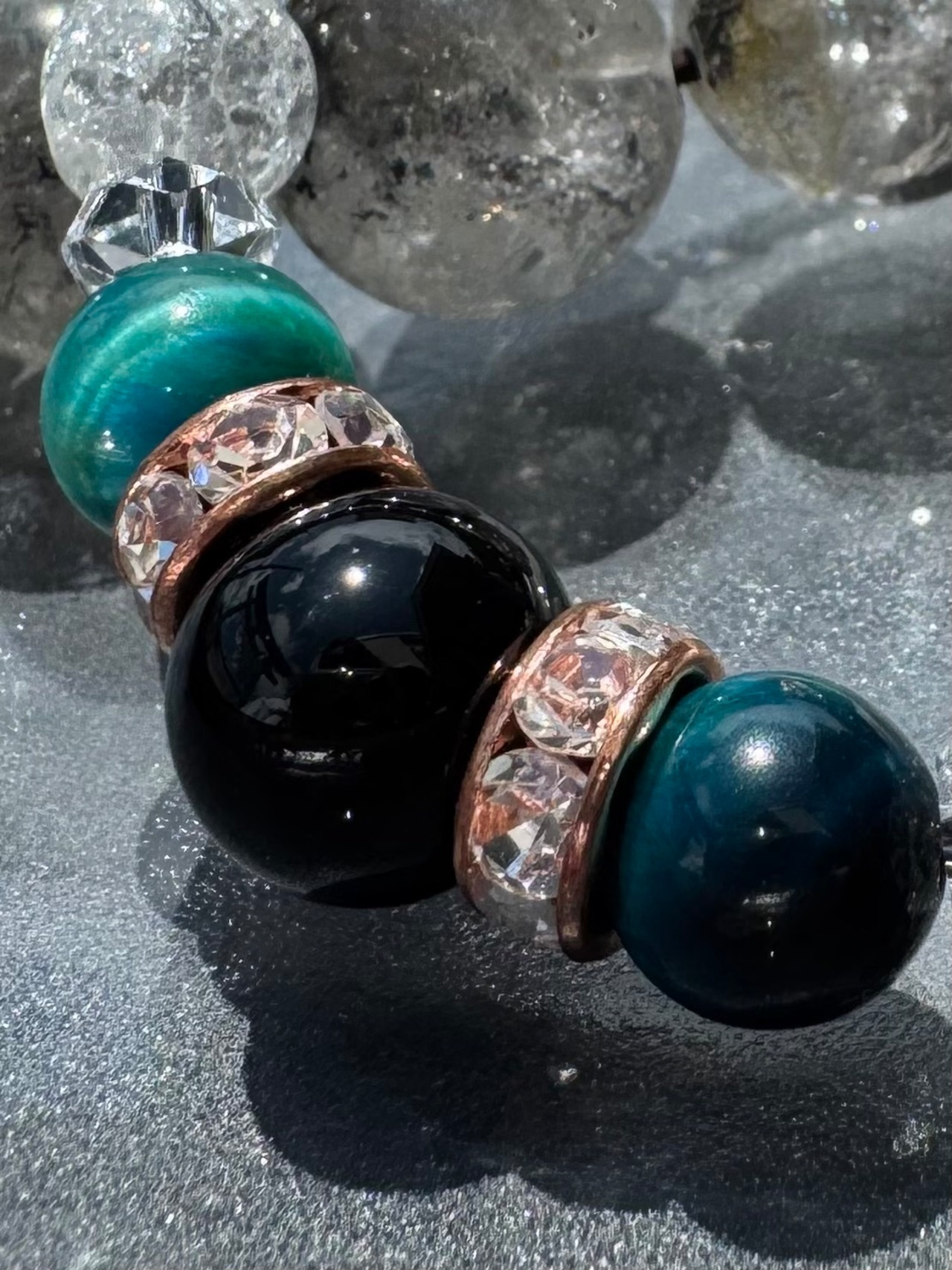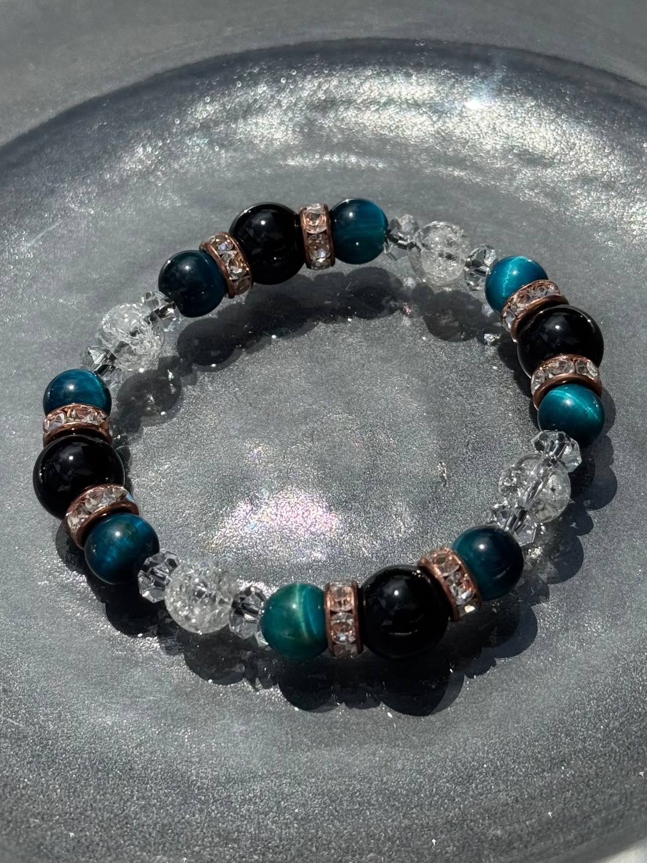 邪を払い内面を整える「オニキス」、希望と冷静さを導く「ブルーグリーンタイガーアイ」、再生と浄化の象徴「クラッククオーツ」。この三種が、心を整え正しい導きをもたらします。