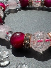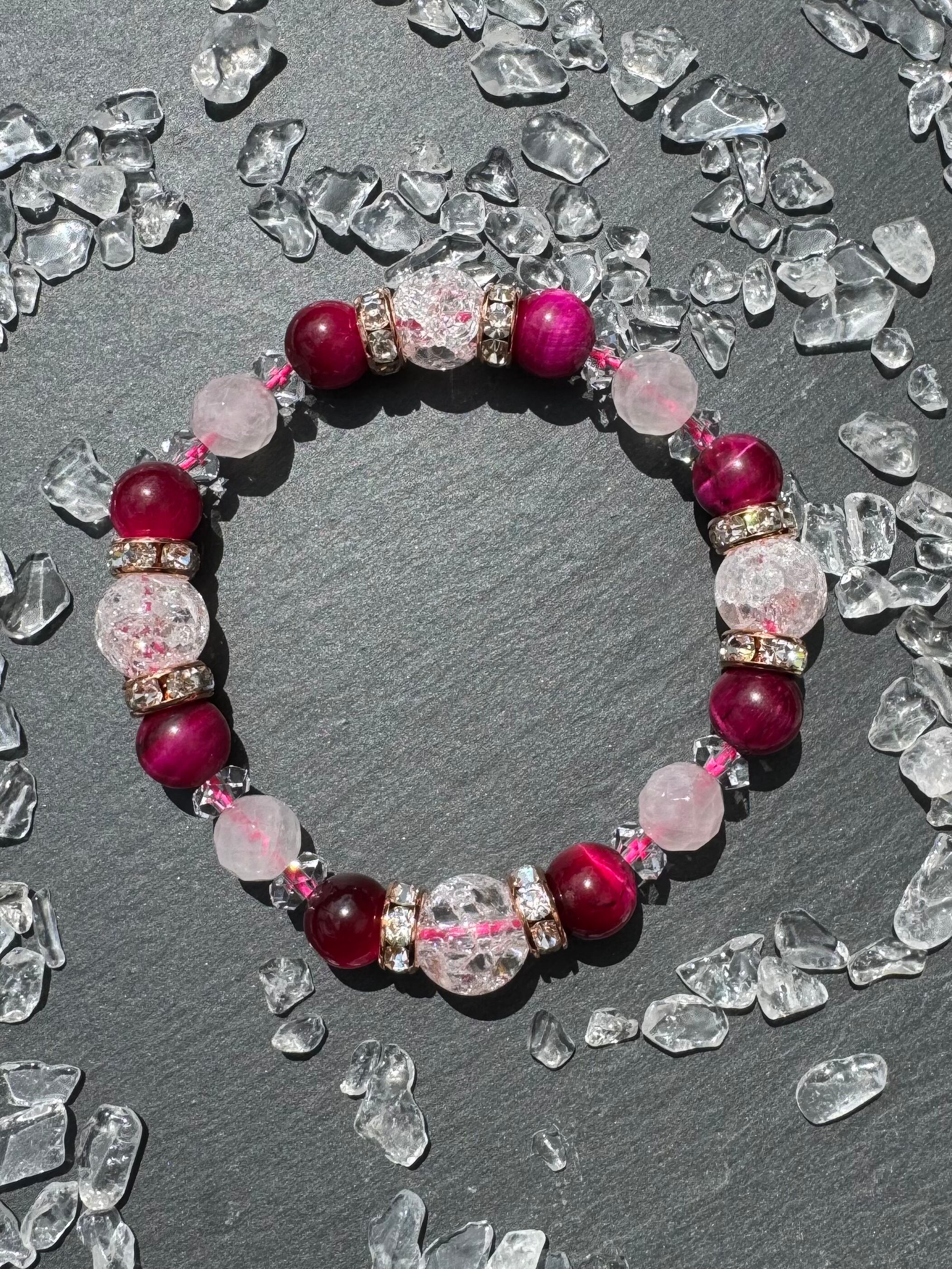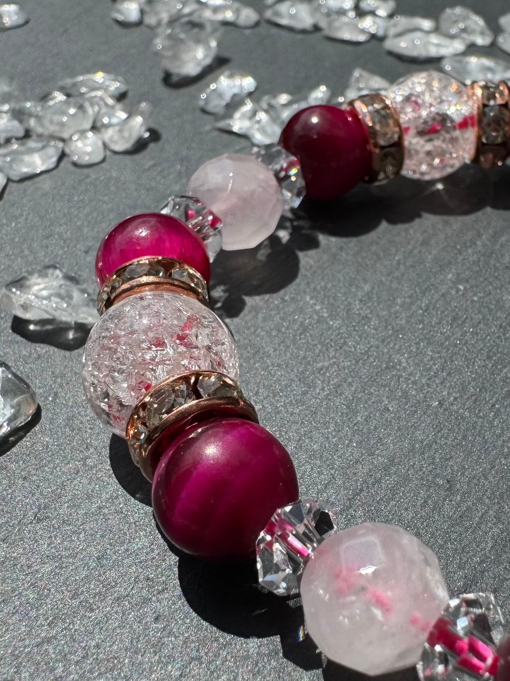 柔らかな愛の波動を放つローズクオーツ、女性の魅力と前向きな気持ちを引き出すピンクタイガーアイ、そして心の曇りを晴らすクラッククオーツを組み合わせました。